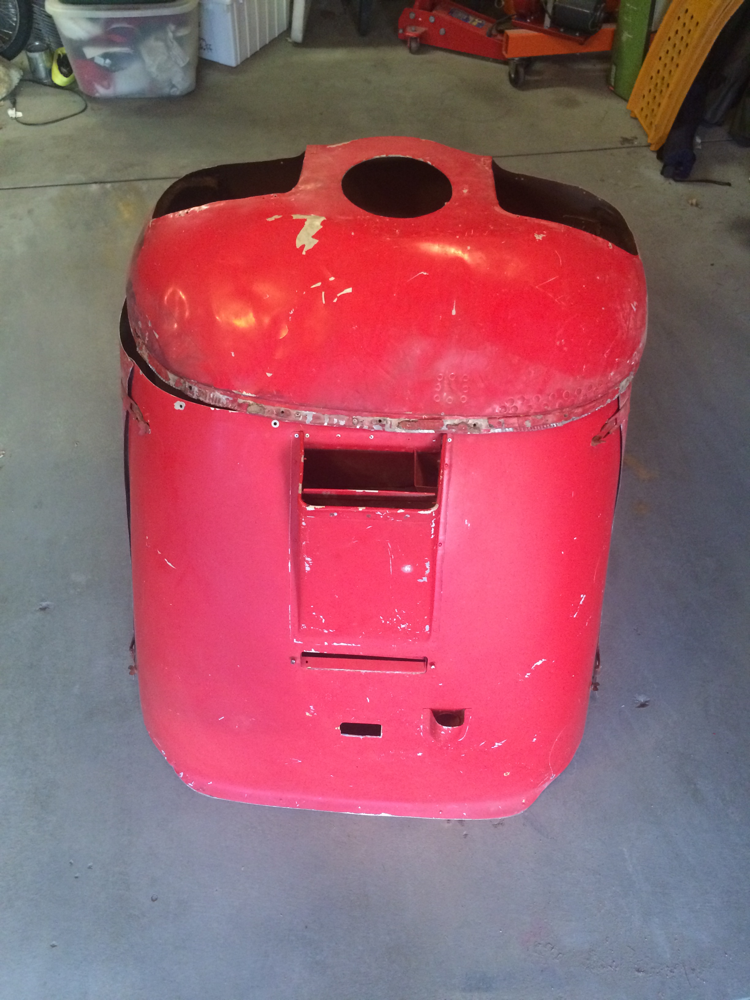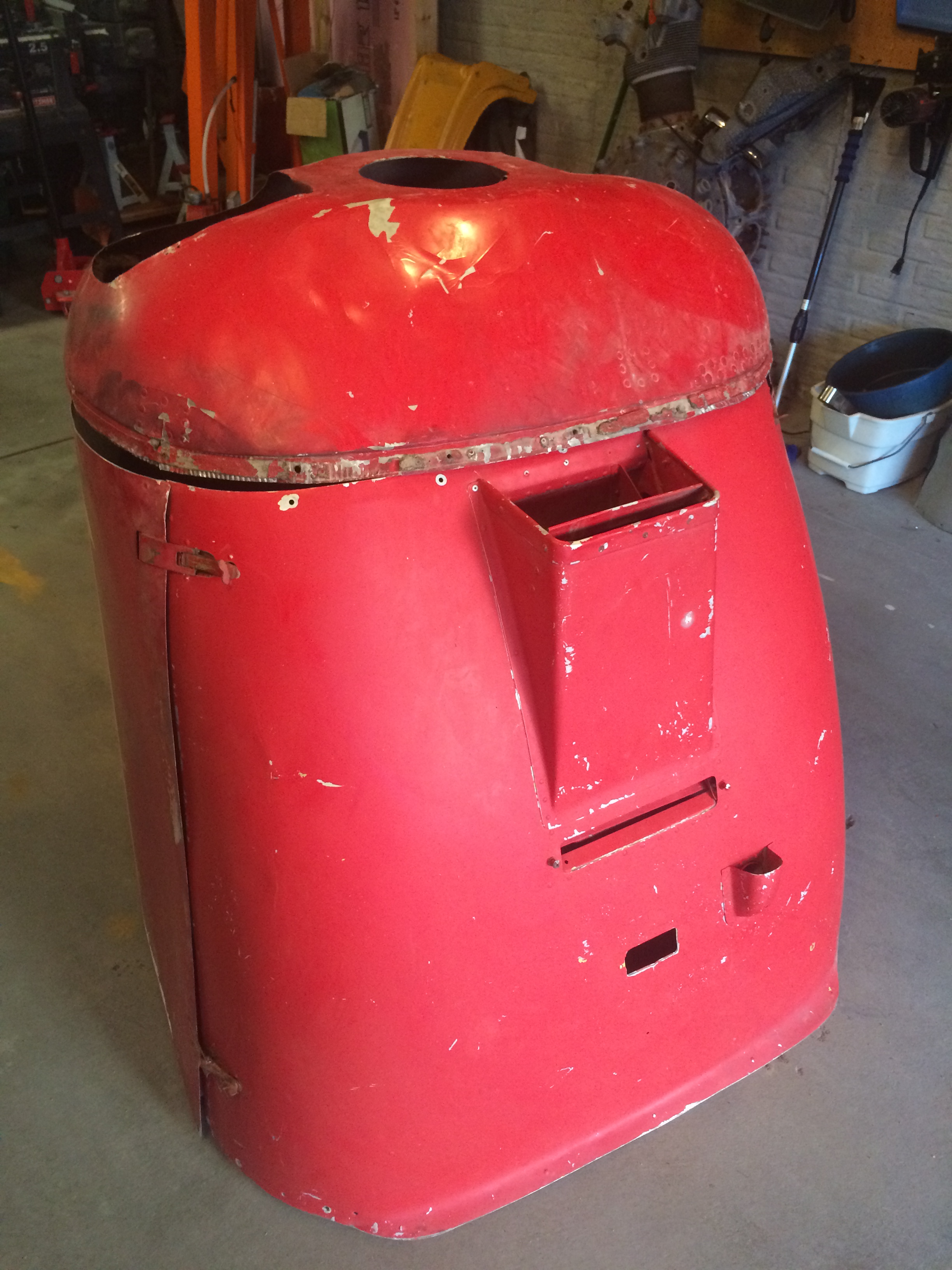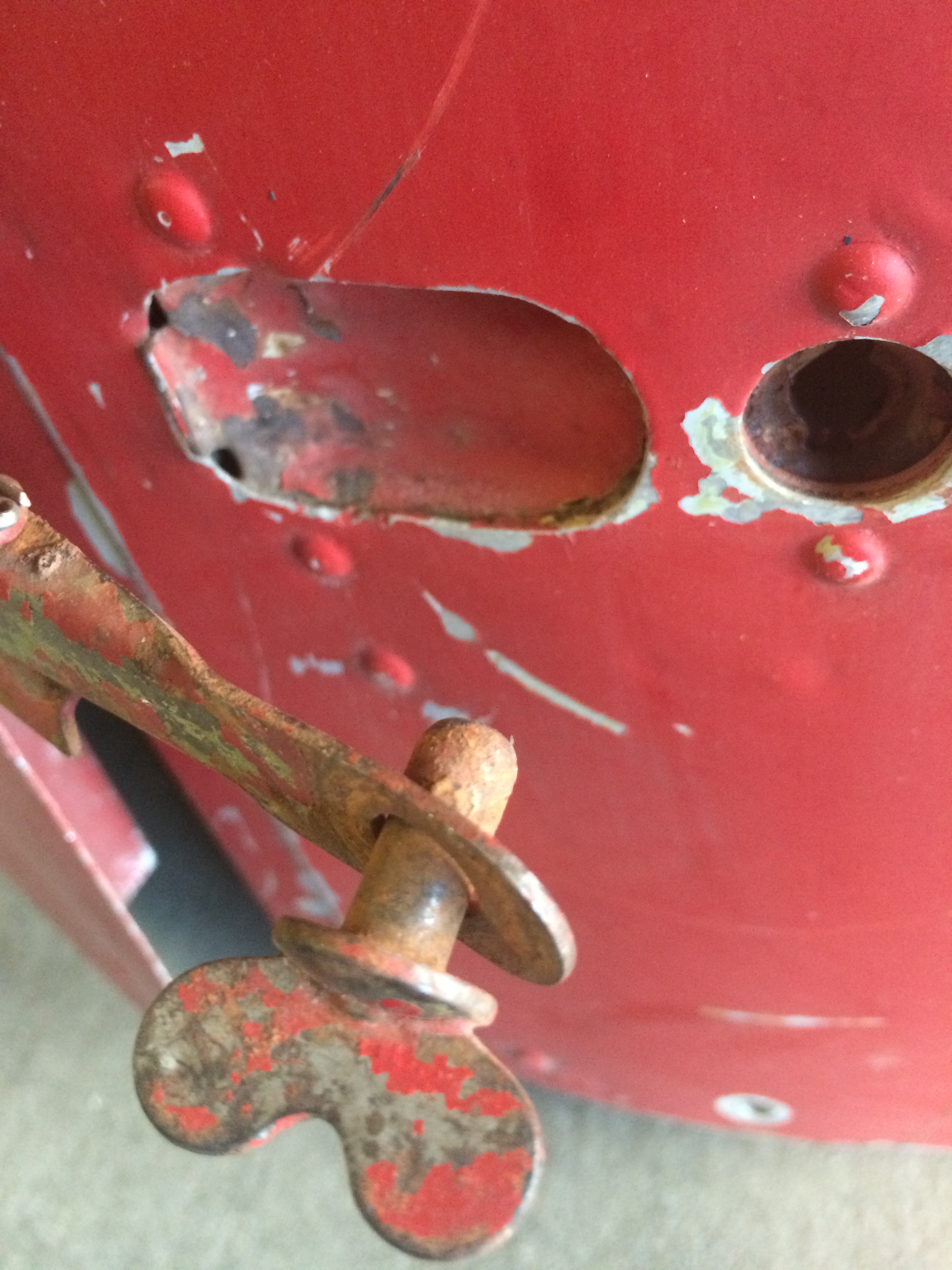 The cowling is in rough shape, too. One hinge point is broken but it’s riveted on so easy to repair. The hinge fasteners are rusty but should work fine once they are cleaned.