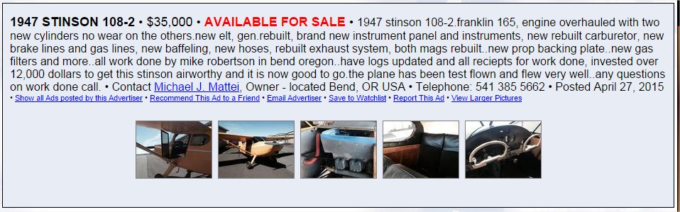 Leave a comment Posted on May 1, 2015May 5, 2015 Uncategorized Stinson Owner History History on the ownership of N9391K. Born on date is April 11, 1947, so the Stinson is 68 years old. $5,015.57 in today’s dollars is $54,777.48. The average condition flyable Stinson 108-2 price on today’s used aircraft market is $35,000.00.