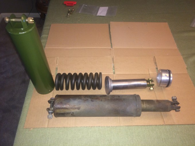 I disassembled and clean the left strut. I replaced the O rings, polished the piston, cleaned and honed the cylinder, and replaced the hardware. The photo shows it disassembled next to the right strut that’s still in sorry shape. The struts are filled with a petroleum based hydraulic fluid that helps dampen landings.