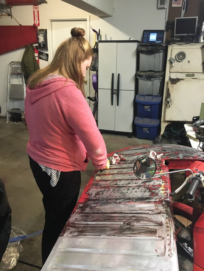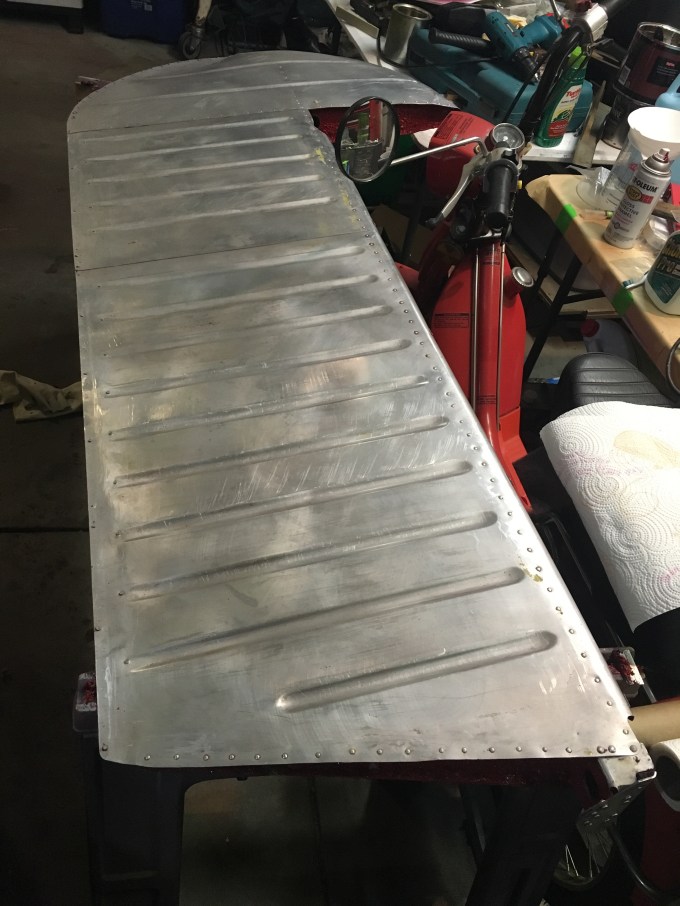 I found a source for some biodegradable non toxic paint remover. I tried it on the vertical stab and it worked great. Now I’m trying it on this. So far so good. You have to leave it on for 12-15 hours and it takes it right down to the aluminum. You can rinse it off with a garden hose and let it go down the drain.