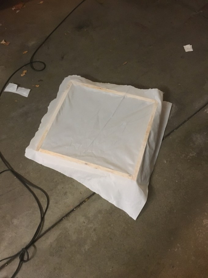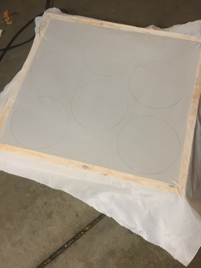 Glue a piece of fabric to a frame. Shrink the fabric with 250 degree heat. Draw 6 1/2″ circles on the fabric, cut out the holes, then attach them over the inspection rings. This happens after the Poly brush goes on. The photos are in reverse order.