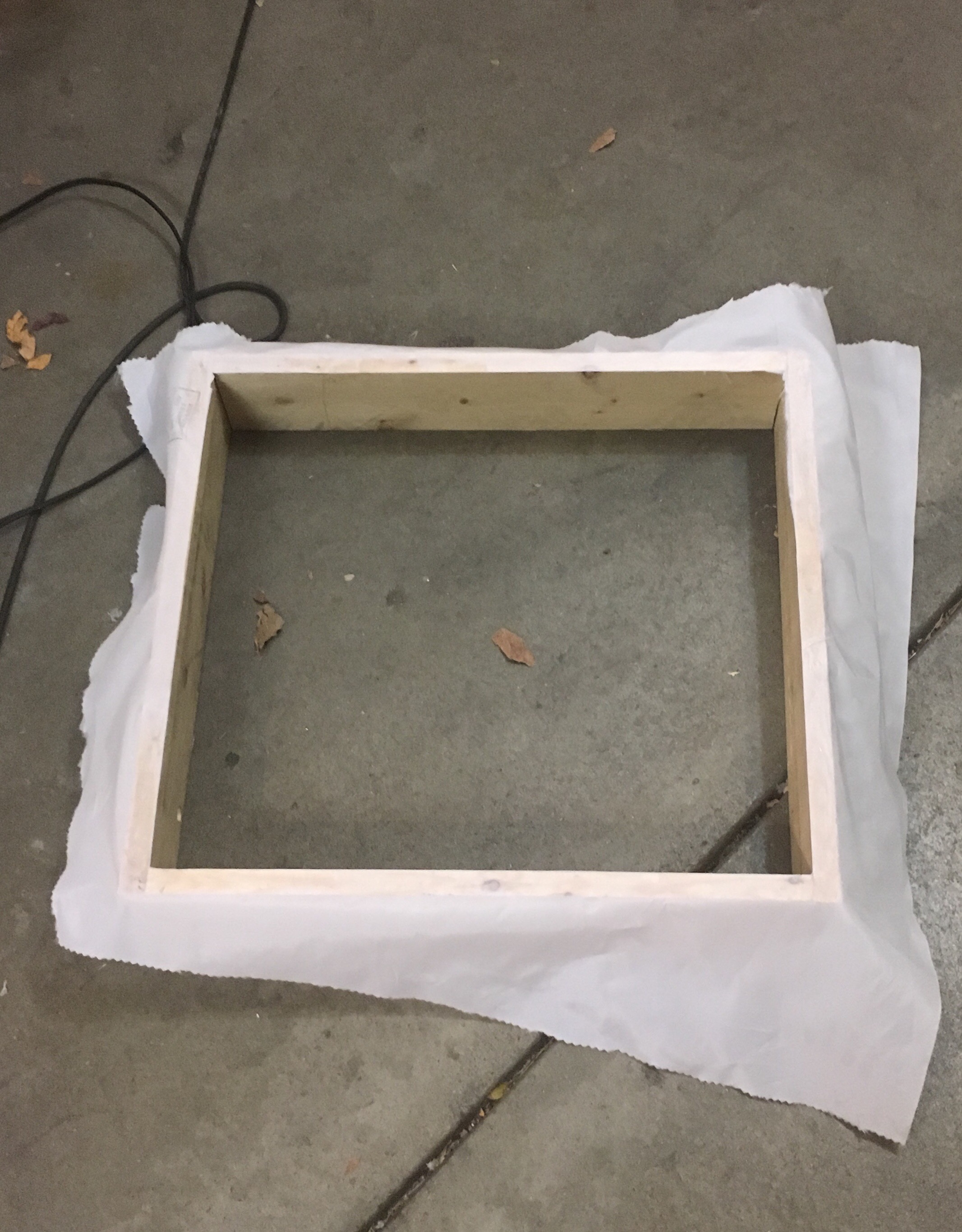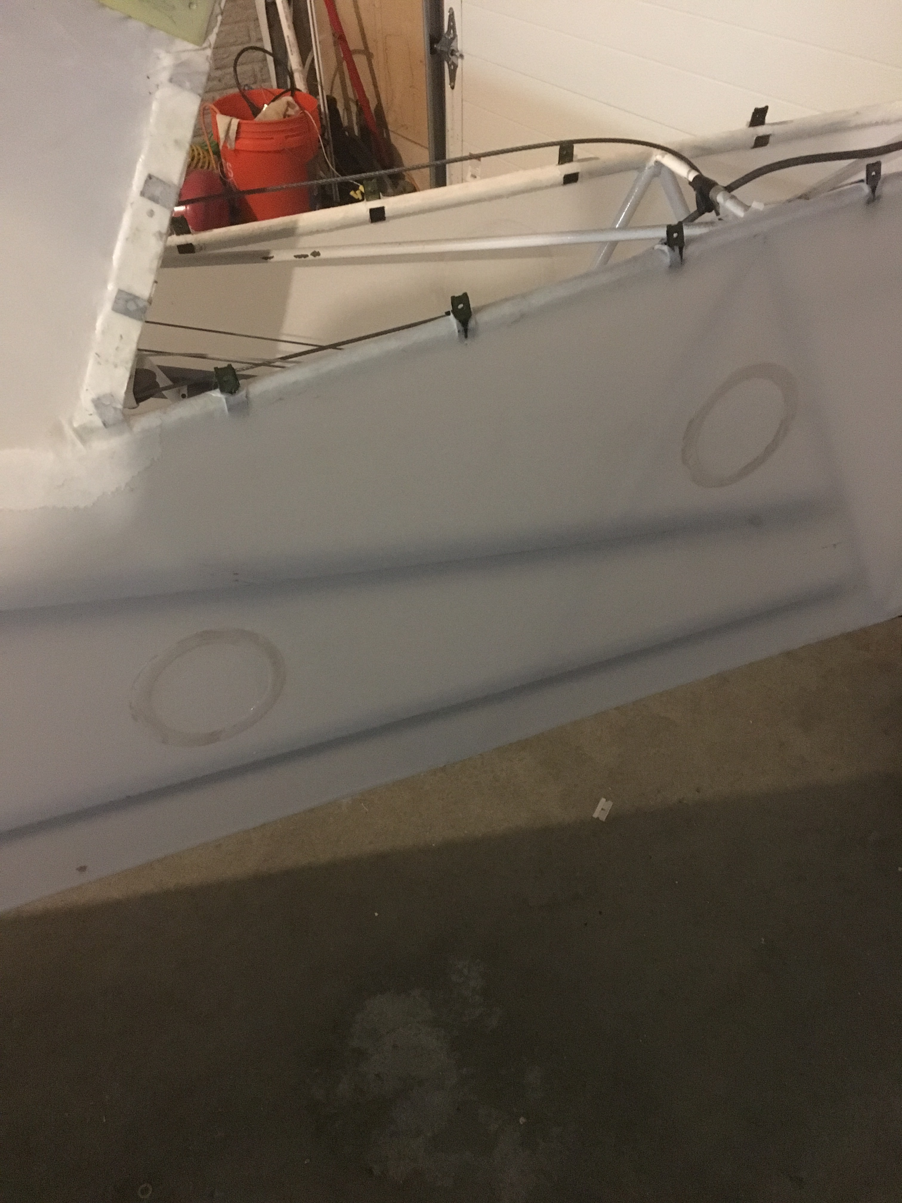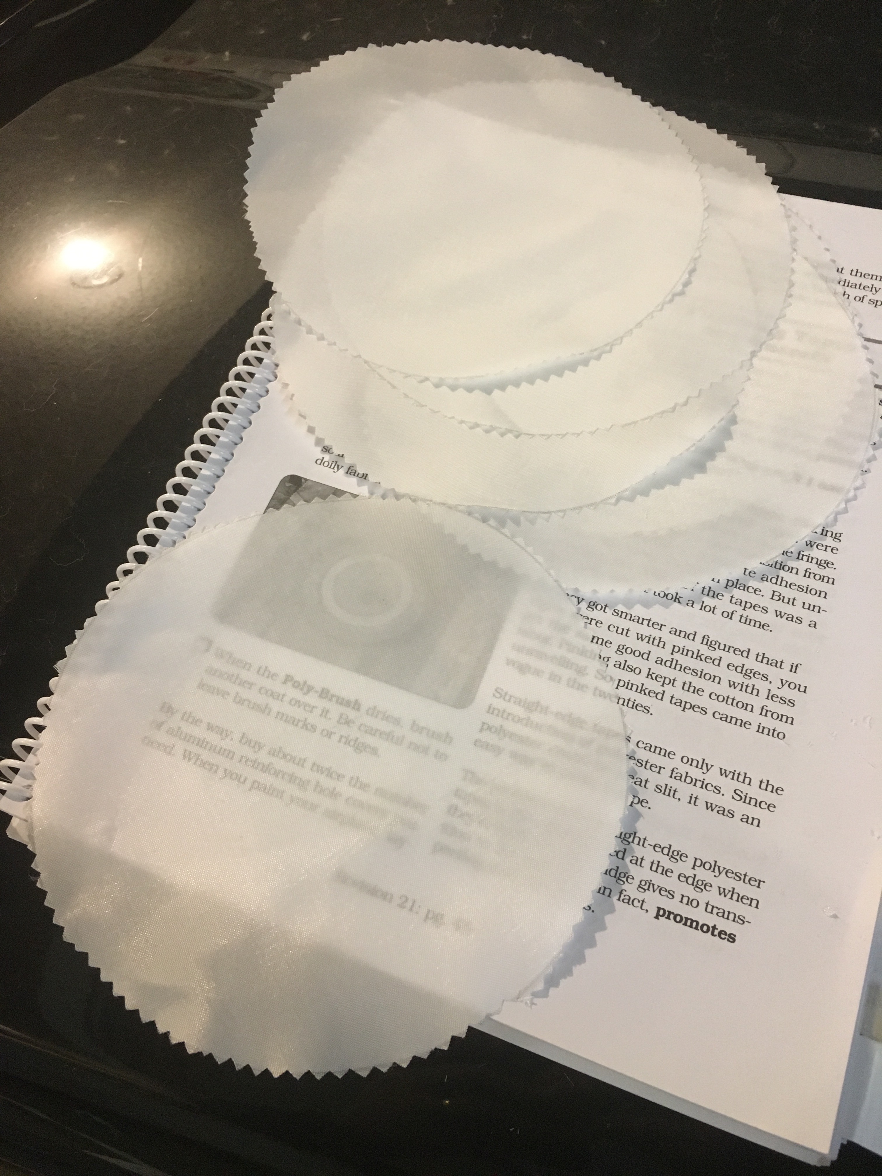 Glue a piece of fabric to a frame. Shrink the fabric with 250 degree heat. Draw 6 1/2″ circles on the fabric, cut out the holes, then attach them over the inspection rings. This happens after the Poly brush goes on. The photos are in reverse order.