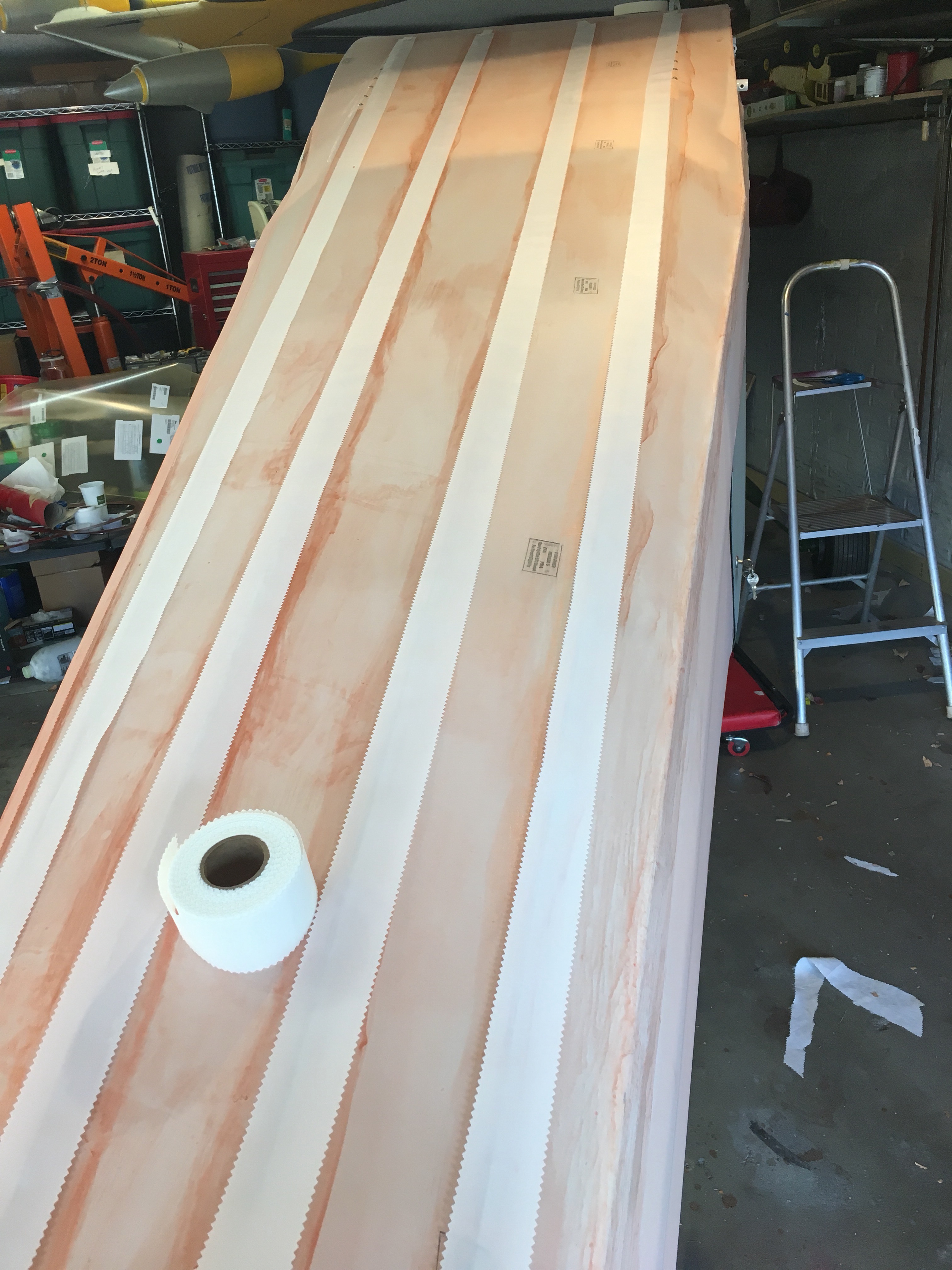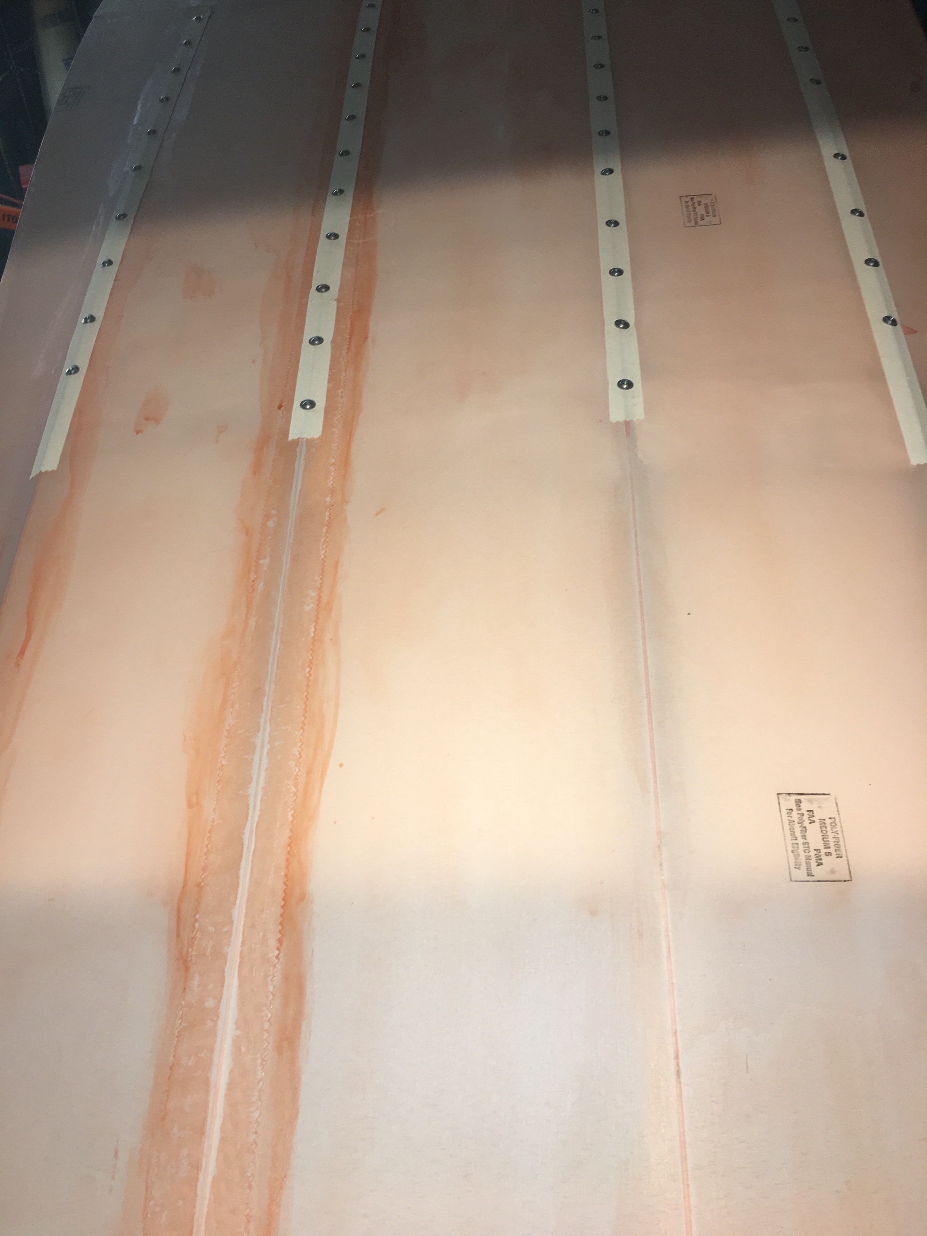 The white tape covers the fabric and allows for a protective covering between the PK screws and washers that hold the fabric to the fuselage. Without the screws the fabric would pull up from the top of the fuselage during flight, due to lift. The screws get a final tape over the top which you can see in the first photo.