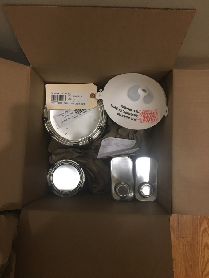 The silver Poly Spray ultraviolet protective coat, some thinner, a few special filters for the poly spray, and more Poly Brush.