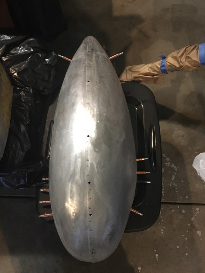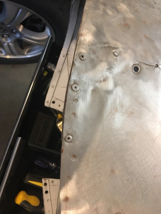 Cleaning up the second wheel pant and removed pop rivets from the edge supports. Removed the rear support and straightened it out. Ready to properly rivet it in place.