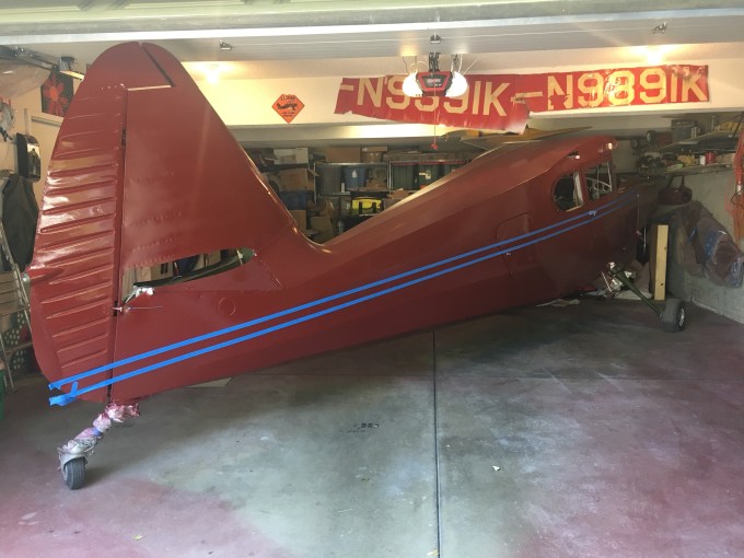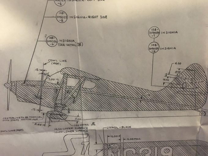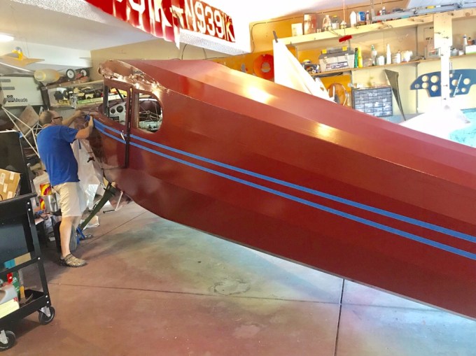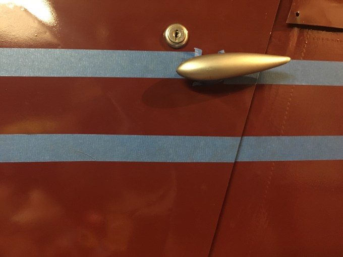Between the two blue lines will be the Diana Creme stripe. I put on the tape where the plans say to apply but compared to other stinsons the stripe looks too close to the door knob. I won’t paint until I get it right.