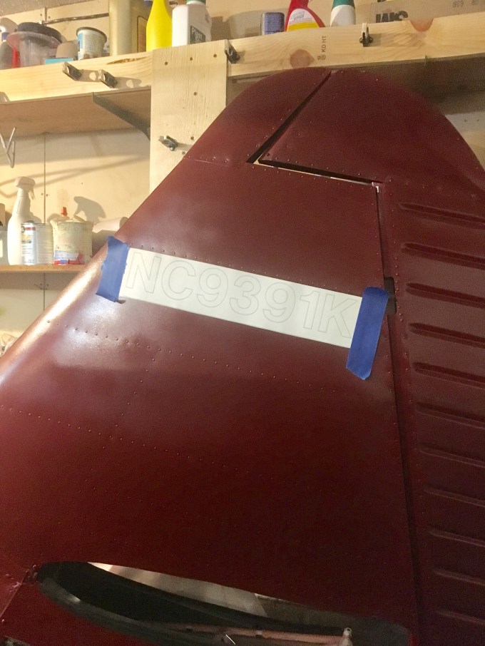 Beginning the placement of stencils. The registration number will be the same color as the stripe as will the Stinson logo on the tail and the cowling.
