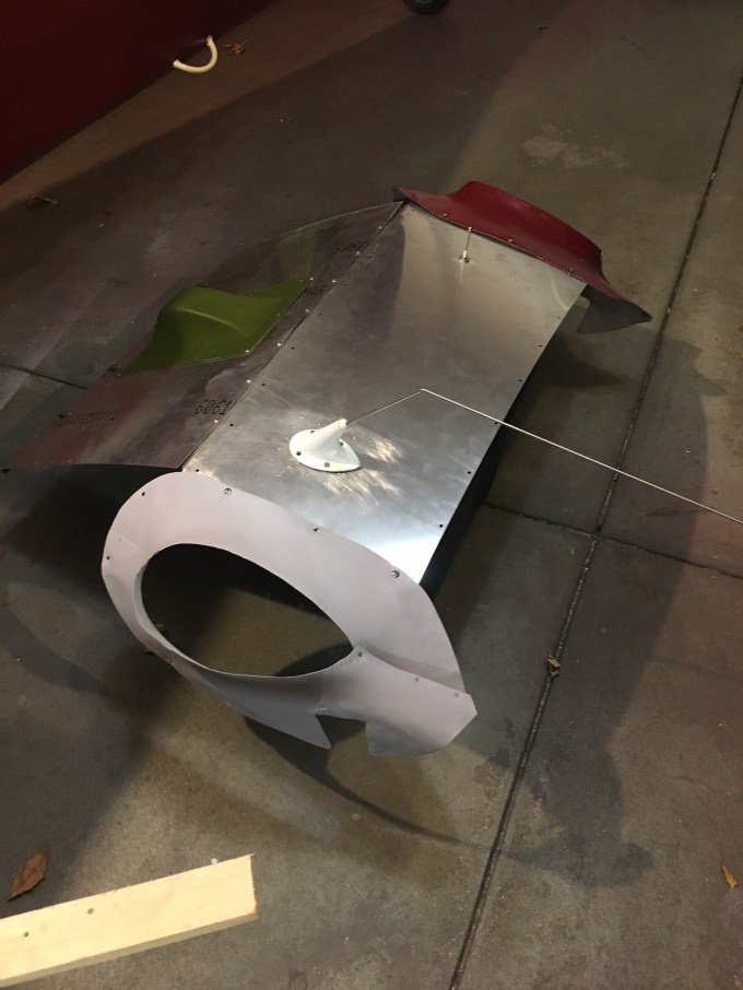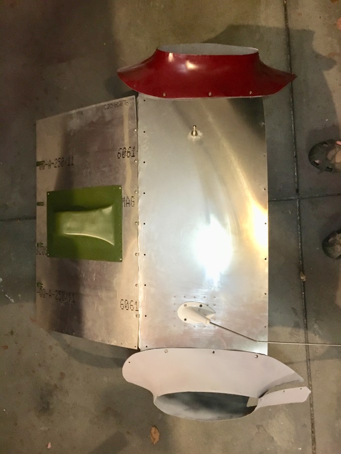 The bottom panels connected along with the landing wheel fillet assemblies attached and the antennas mounted. Turn all this over and it mounts between the gear and behind the lower engine cowl.