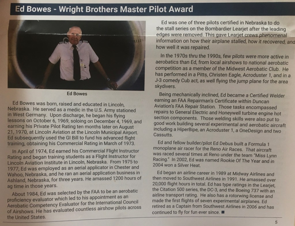 Ed Bowes, the guy who does any welding for me on the Stinson, received the Wright Brothers Master Pilot Award. Ed’s been around Duncan Aviation for a long time. I met him at an airshow in Lincoln when he was a Pilot for Southwest. Congrats to Ed