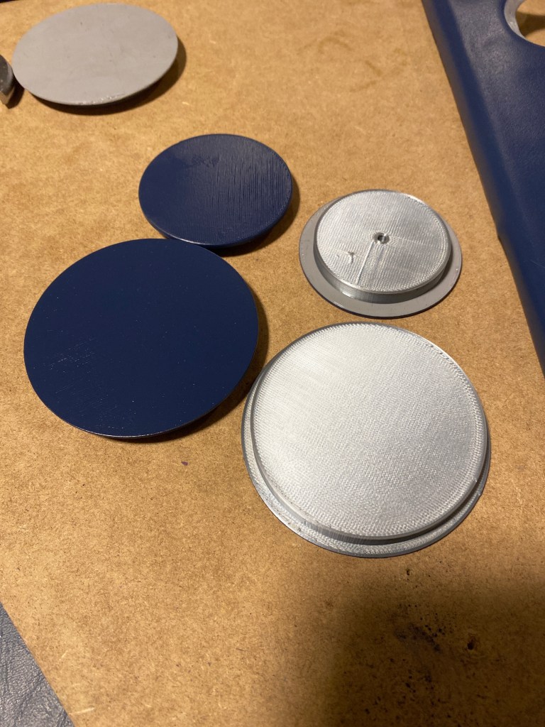 I had some difficulty getting the circles around the instrument panel to be circles. Taping off with blue tape didn’t give me a “perfect” circle as you can see in some of my previous photos. So I designed some paint plugs to fit in snugly in the holes so I could paint them. I used my 3D printer to make enough to blank out the holes. I think it looks much better.