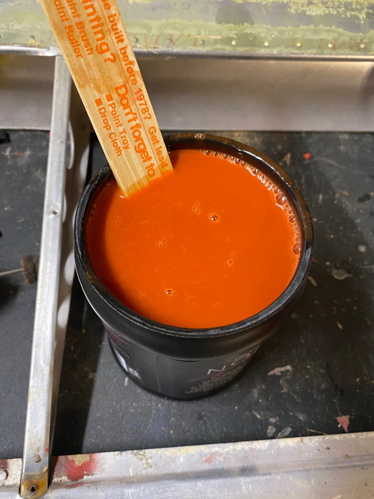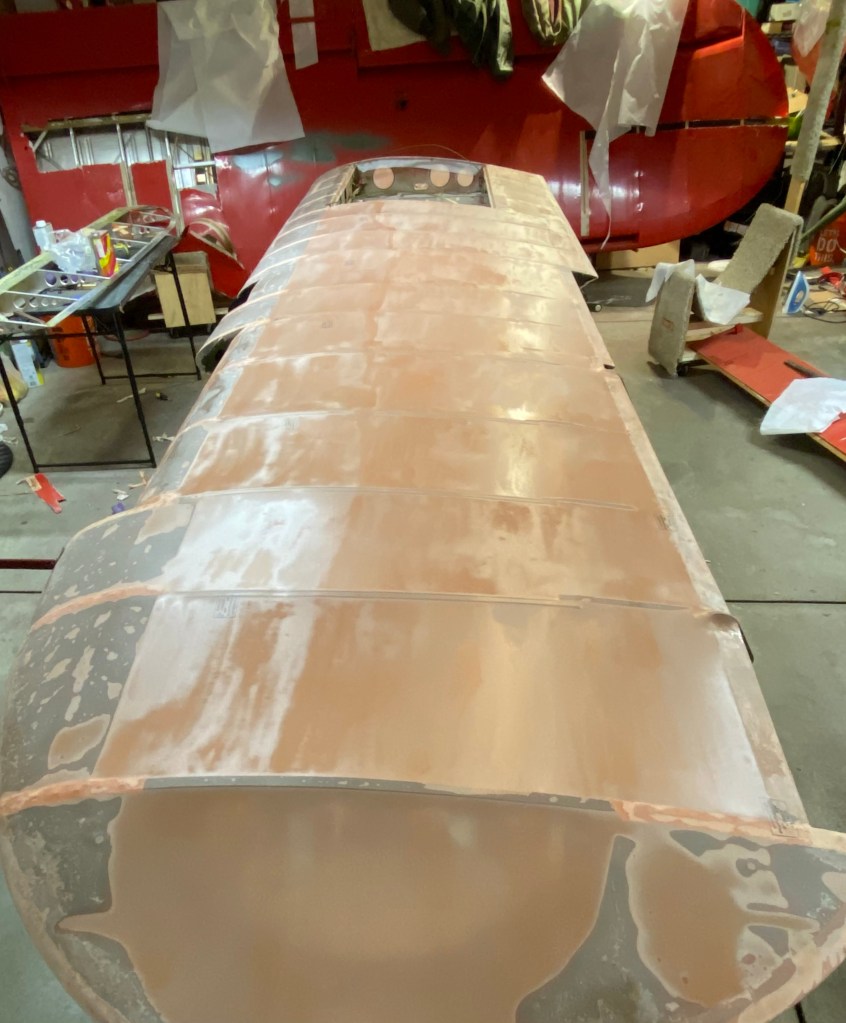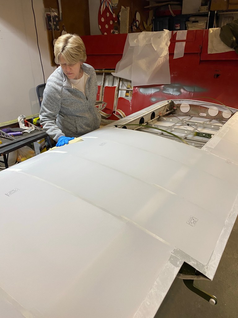 First coat is brushed on after a wipe down with MEK and a tack cloth. Marie pitched in to help with the tack rag.