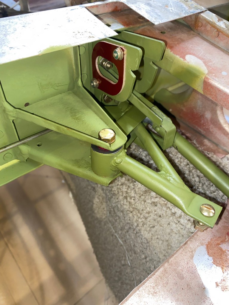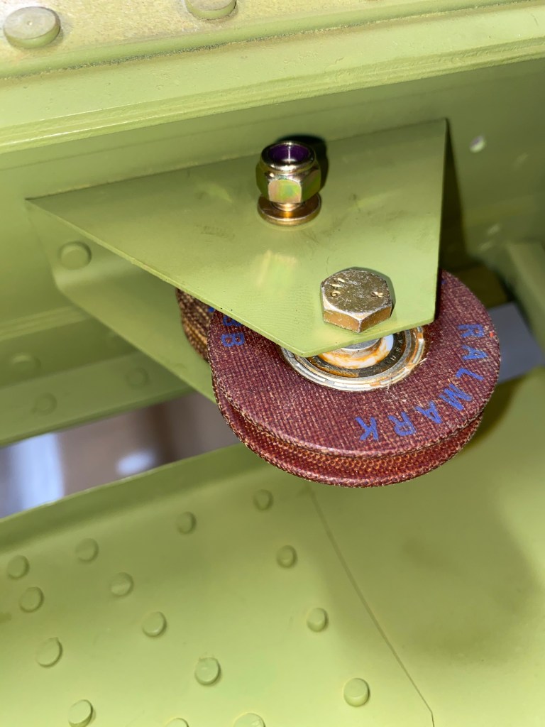 Aileron Bellcrank. The red stuff is grease and the top bolt is not installed upside down. It is correct for those of you who will ask 😉Flap control Bellcrank installed New aileron cable pulleys in place. I have to remove them when I run the new cables so they are not tightened down. Wing root fuel tank strap and cable feed through installed
