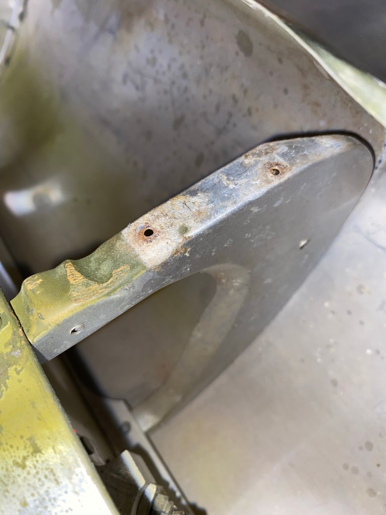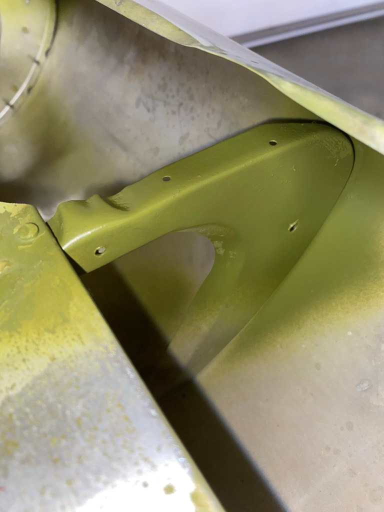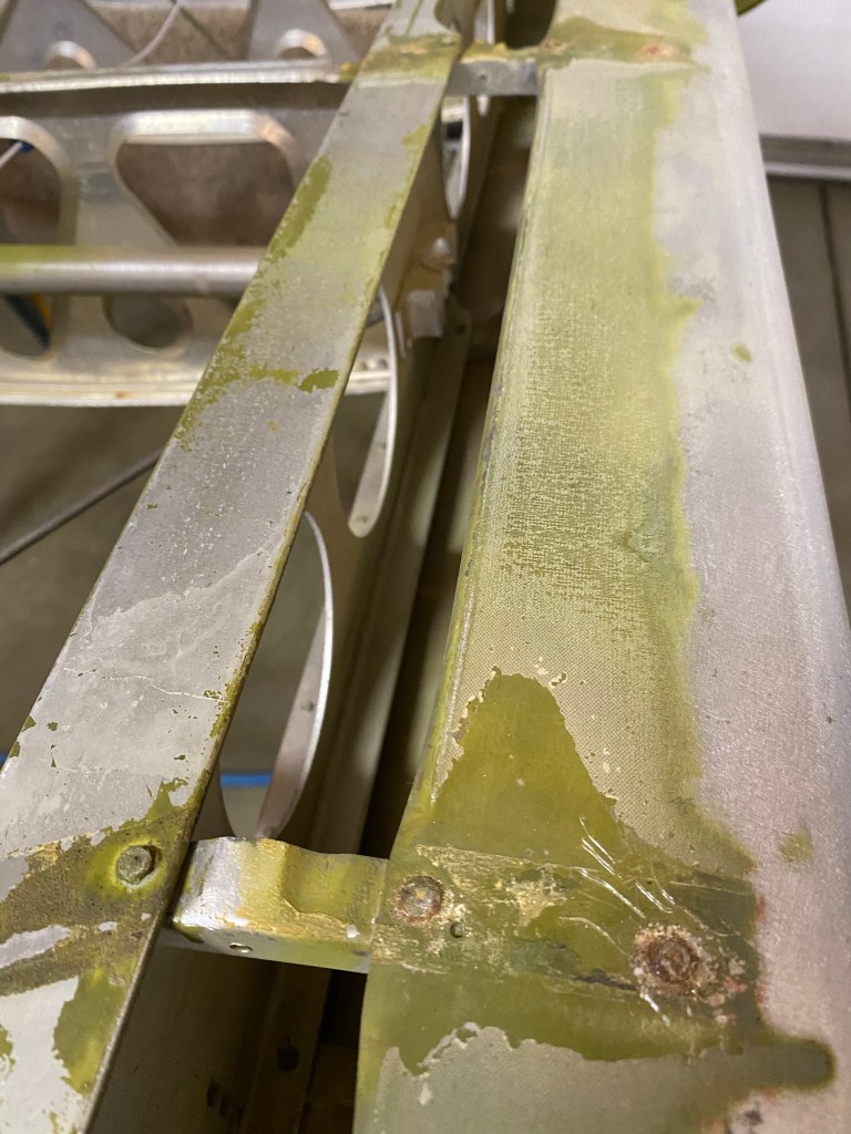 Some aluminum oxide corrosion on the nose ribs under the leading edge aluminum. After removing it I applied zinc chromate as an anti corrosion layer.