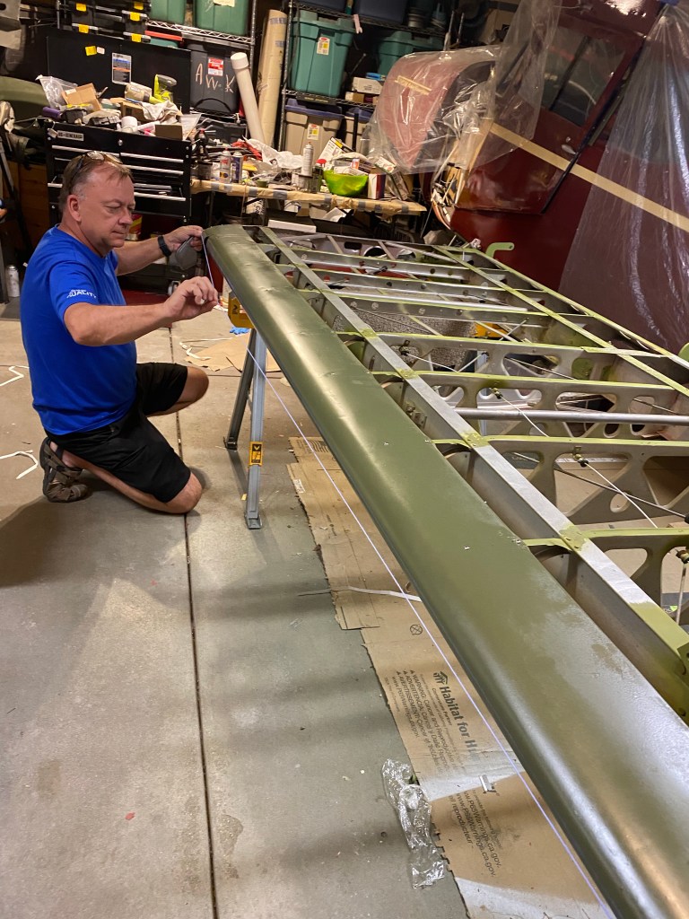 Posted on July 21, 2021 Uncategorized Wing Covering Ready to cover the bottom. I will start coving on Saturday. Tape over the screw and rivet heads Snapping a chalk line for the fabric Chalk lines up close. Share this: Click to share on Facebook (Opens in new window) Facebook More Click to share on X (Opens in new window) X Like Loading...