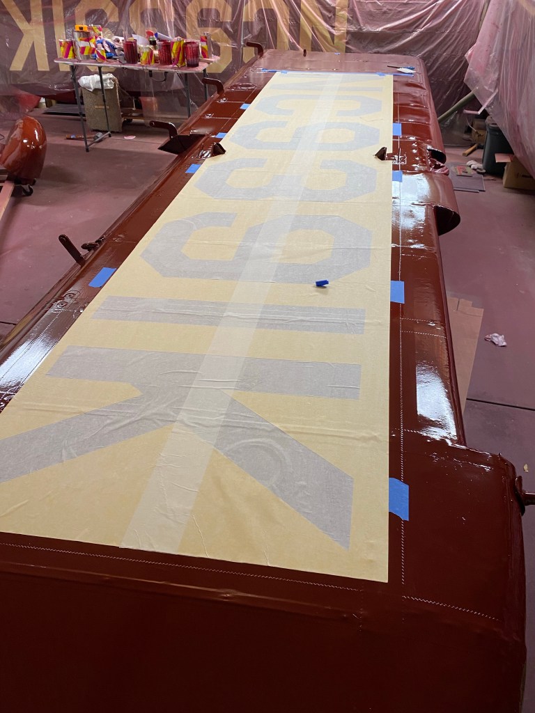 Stencil on and ready to peel back the top layer to reveal the numbers Stencil on and application paper removed Masked and ready to paint. Scuffed up the paint after this photo to allow the Creme color to adhere. Paint appliedStencil removedDoug stopped by this morning.
