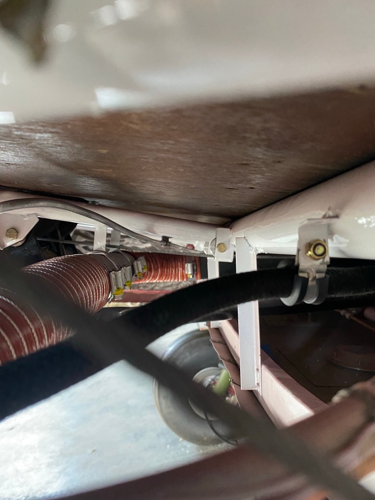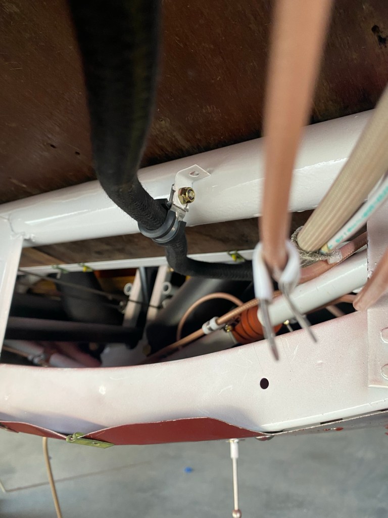 Brake line running through the bottom fuselage. Not a lot of room between control cables and brake lines. Rudder cable is the closest and out of focus. The two farther in are the aileron cables. Just below and behind the brake cable is the elevator tube.